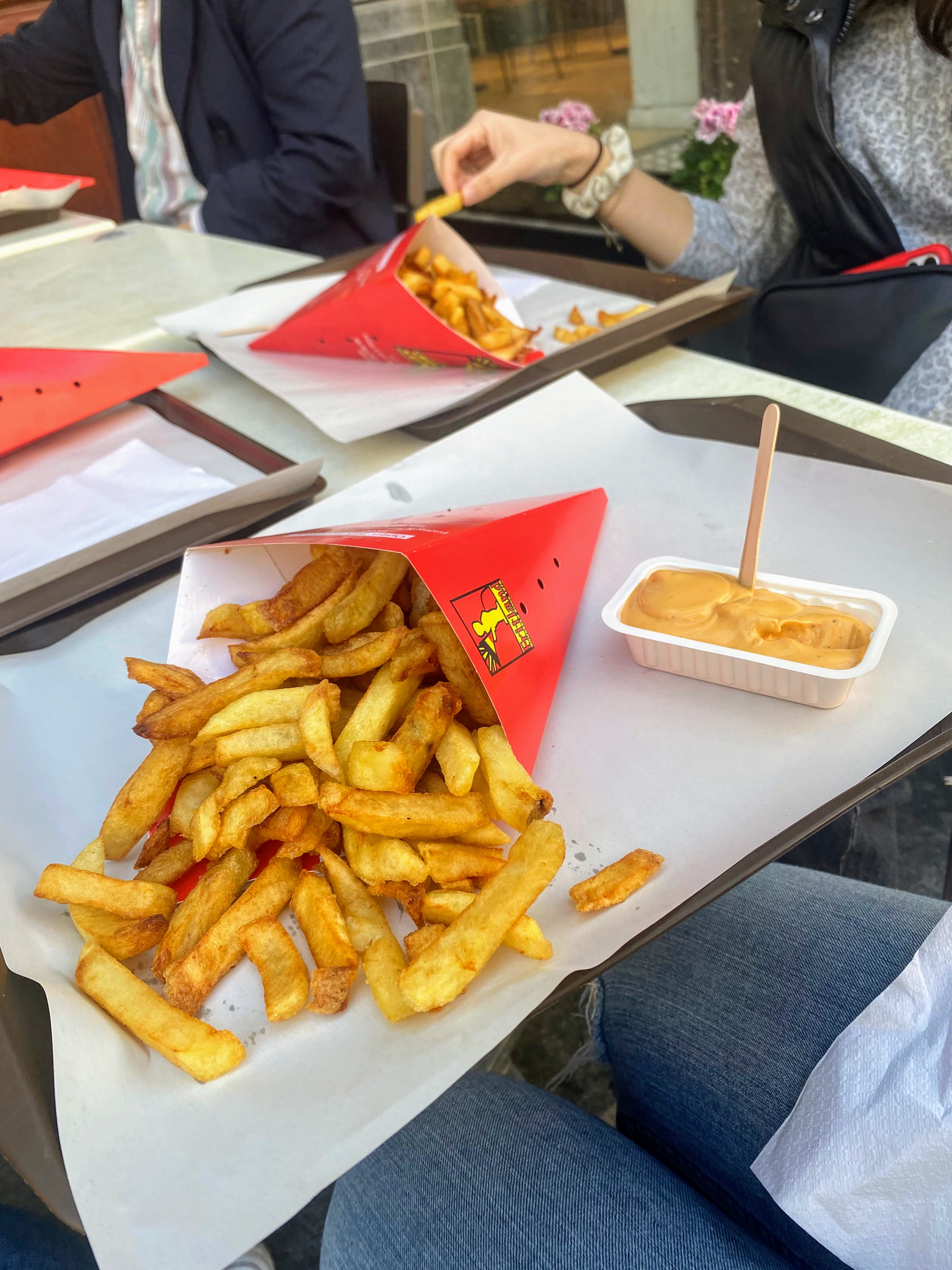 A quick note on waffles in Belgian: There are two types of waffles in Belgian: The Brussels waffle and the Liege waffle. In my brief culinary research, I learned that Brussels waffles are rectangular with deep pockets. They are fluffier and lighter than Liege waffles. Liege waffles are rectangular with rounded corners. “Pearl sugar is mixed in with the dough, which caramelizes when the waffle is cooked. They are thicker, richer, and chewier than the Brussels waffle.” Liege waffles are more popular (and tastier) in Brussels, and the yellow food trucks have the best and freshest waffles.