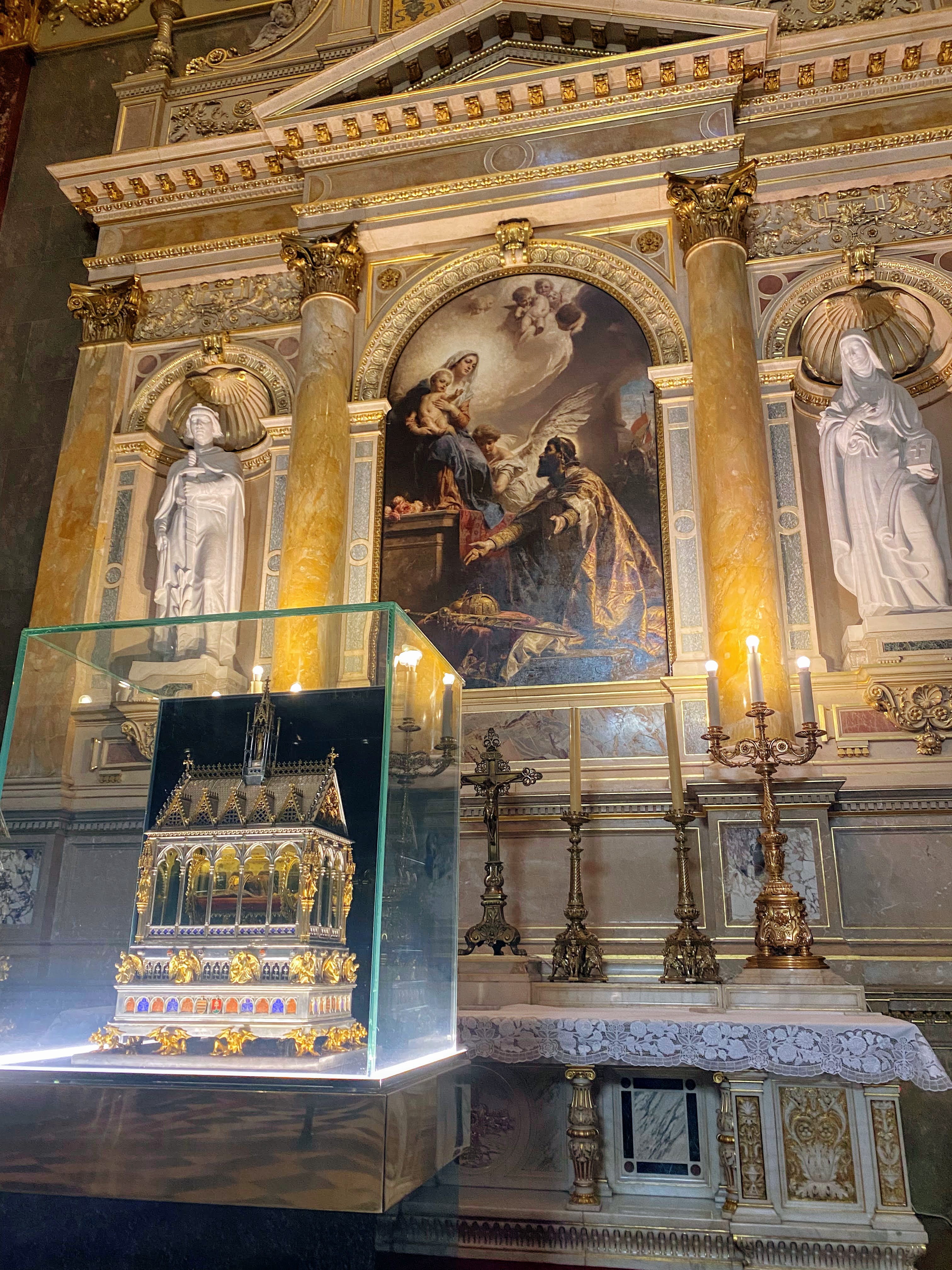 Our first destination was St. Stephen’s Basilica, and we saw the largest relic I’ve ever seen- the Holy Right Hand of King St. Stephen of Hungary. (Is it obvious we are Catholic?) When St. Stephen’s corpse was exhumed during the process of canonization, the examiners found that his right arm did not decompose. Naturally, they turned his right arm into a relic. Other notable features of the Basilica include the massive organ, the panoramic lookout from the dome, and the statue of St. Elizabeth of Hungary (one of my favorite saints). The altar was also magnificent, even with the cross and tabernacle clothed in purple to match the Lenten season.