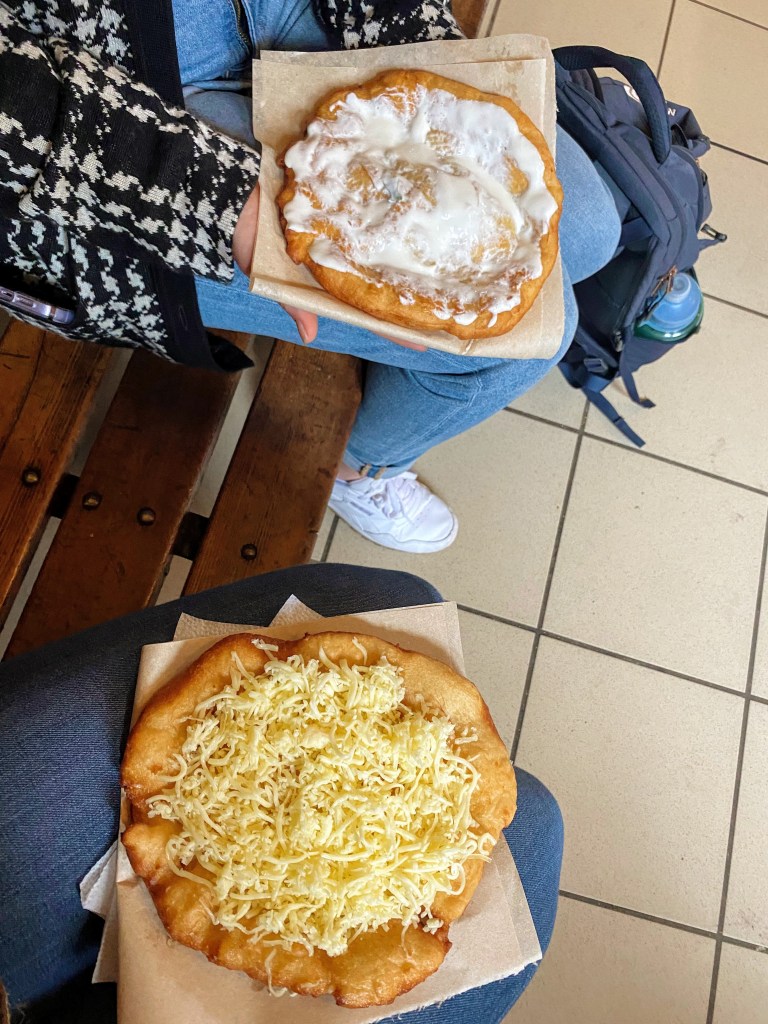 For lunch, we crossed the river back to the Pest side of Budapest and went to Central Market Hall. We tried lángos (“lan-gosh”)- deep-fried bread made with potatoes and topped with sour cream, cheese, or both. Rachel and I agreed that eating lángos was a highlight of our time in Budapest, and we had them again for dinner. We also tasted other traditional Hungarian food that is similar to Czech food, such as beef goulash and cinnamon spit cake, kürtőskalács (I have no idea how to pronounce this word). Hungarians make tastier goulash, but the Czechs win with the cinnamon spit cake (“trdelník” in Czech).