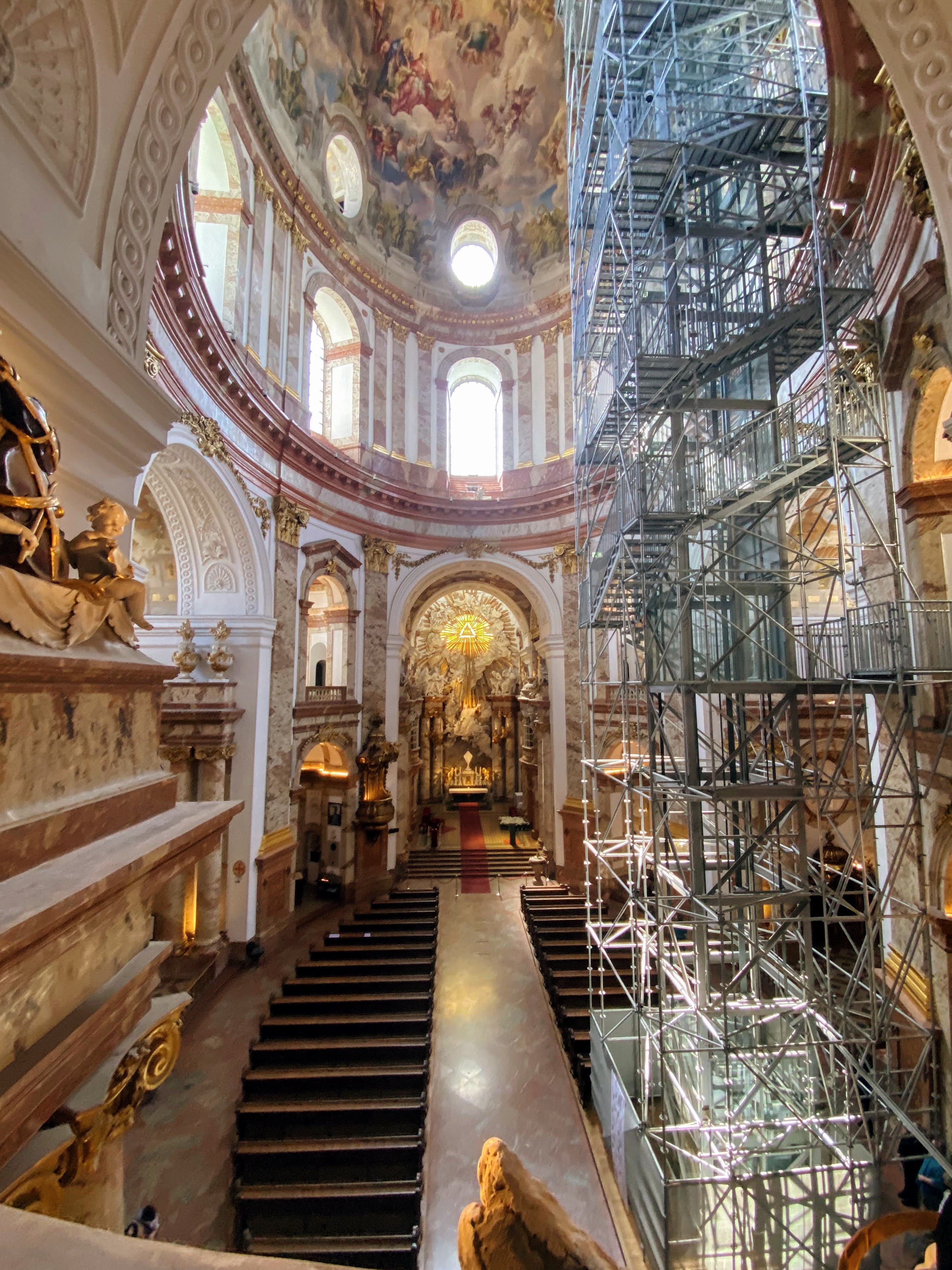 The first site we visited was Karlskirche, the Church of St. Charles of Borromeo. We paid for entry to the church, the platform in front of the cupola, and the indoor elevator ride to the church ceiling to see the frescos up close. We were disappointed with the view from the cupola platform and did not wish to stand in line for the elevator. I wish there was a better way to display the frescos without installing an industrial elevator inside the Church. The church was beautifully preserved, and the elevator stole some of the church’s grandeur.