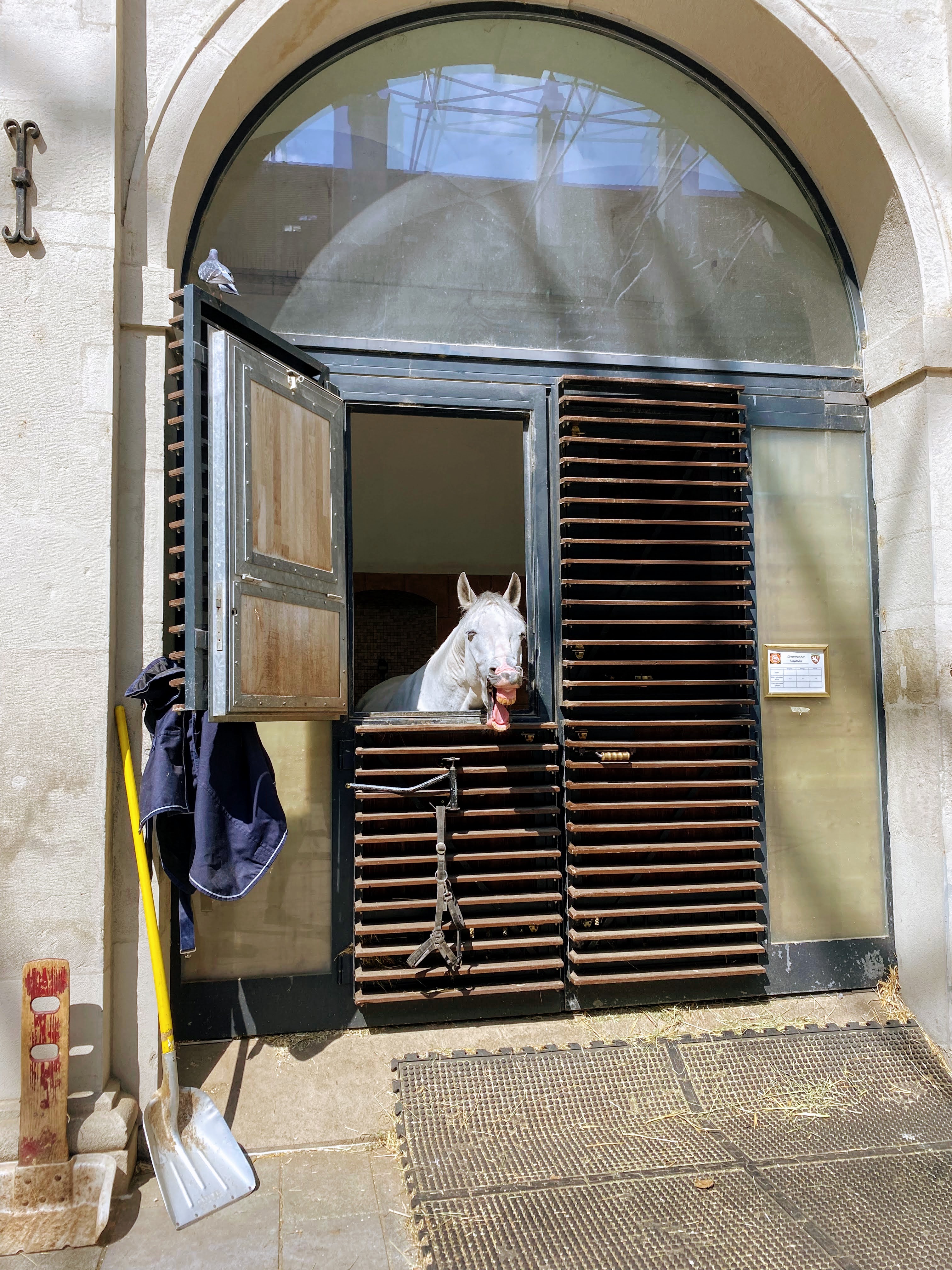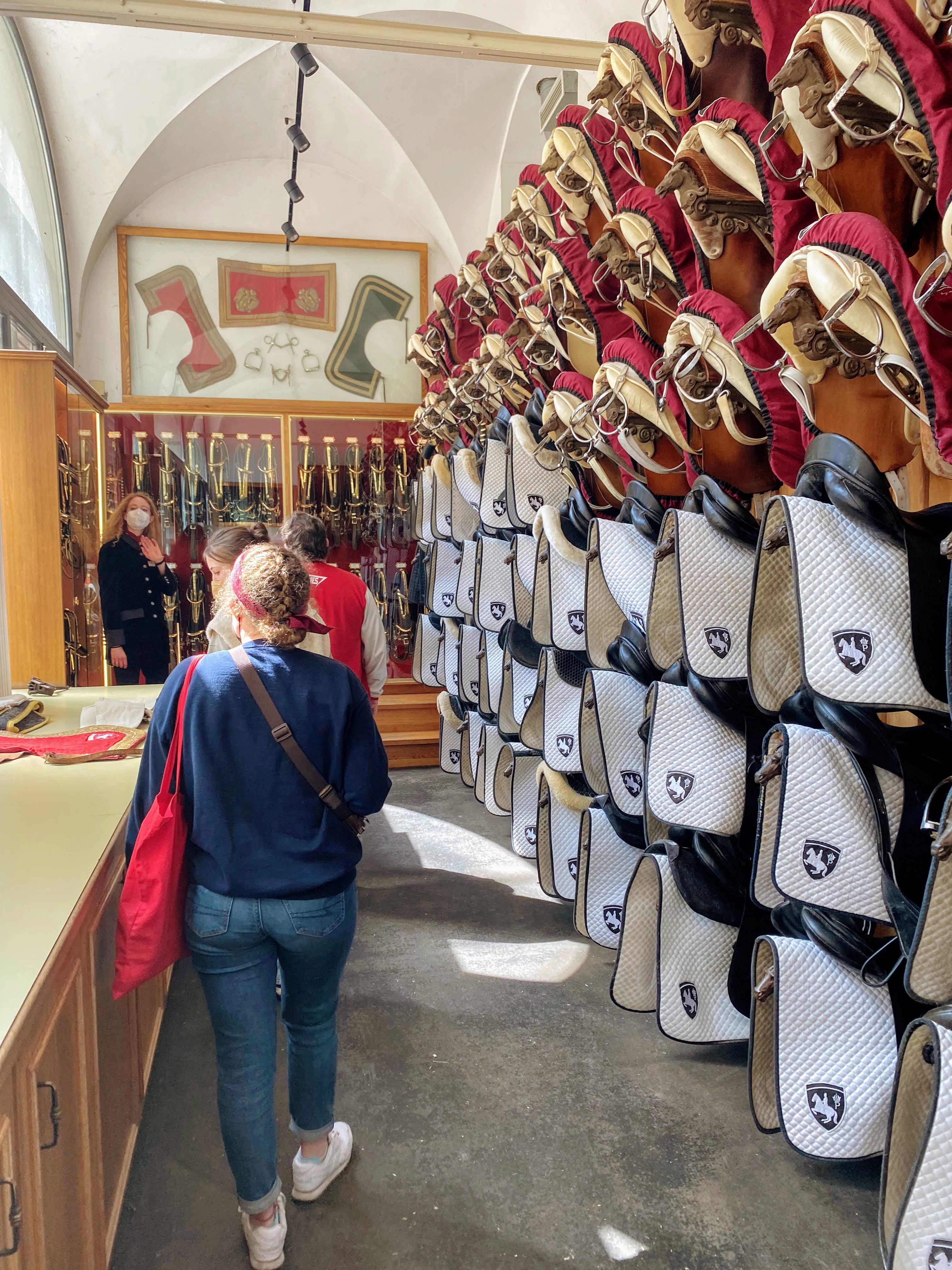 After the training sessions, we went on a guided tour of the stables and saw the horses up close. We learned that the stallions are given two names: the family name of the father and the first name of the mother and are referred to by their mother’s name. For example, the horse Neapolitano Graziella is called Graziella. The horse ballet taught at the Spanish Riding School differs from traditional dressage. For instance, horses begin training at a slightly older age and retire much later than horses trained in traditional dressage. A Lipizzaner is taught every basic dressage skill but is only an expert in one or two movements; not all stallions train for the famous Capriole jump, for instance. (Rachel and I were fortunate to see this skill during the public training session!) Horses in traditional dressage are trained as experts in every skill, no matter if the horse is ill-suited for a particular movement. The tour guide was subtle in explaining why the Spanish Riding School was superior to dressage, and I have no reason to doubt her.