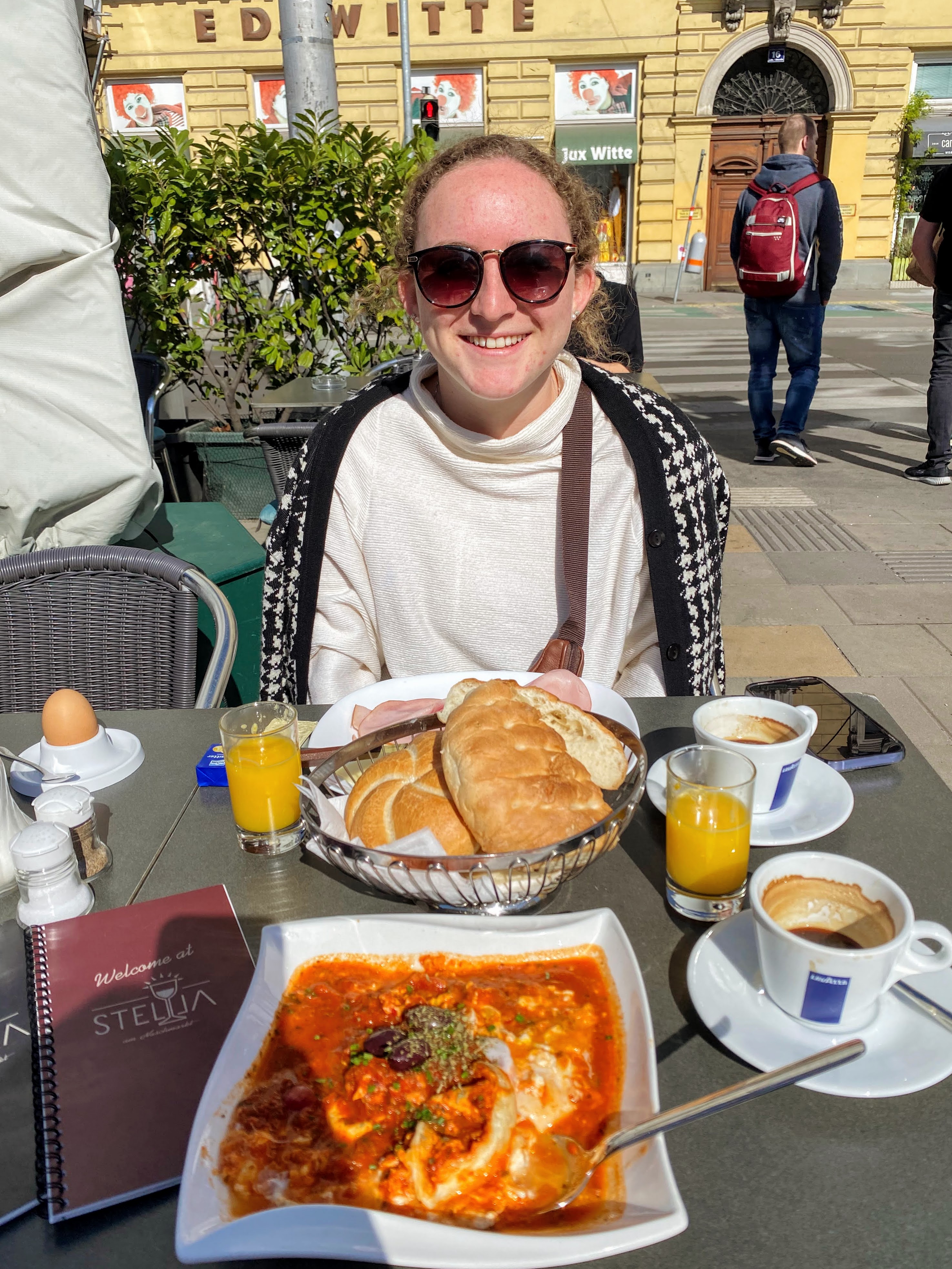 Naschmarkt We ate a few times at the large open-air market, which was right across from our hostel. We had breakfast at Stella’s, a small restaurant in the center of the market. Rachel tried the Viennese breakfast and I had shakshuka. Although not a traditional Viennese food, shakshuka is popular here because of the lasting influence of the Ottoman Empire in the 16th – 17th century. (Coffee is also a lasting influence from the Turks.) I think shakshuka is my new favorite food, and I can’t wait to try making it!