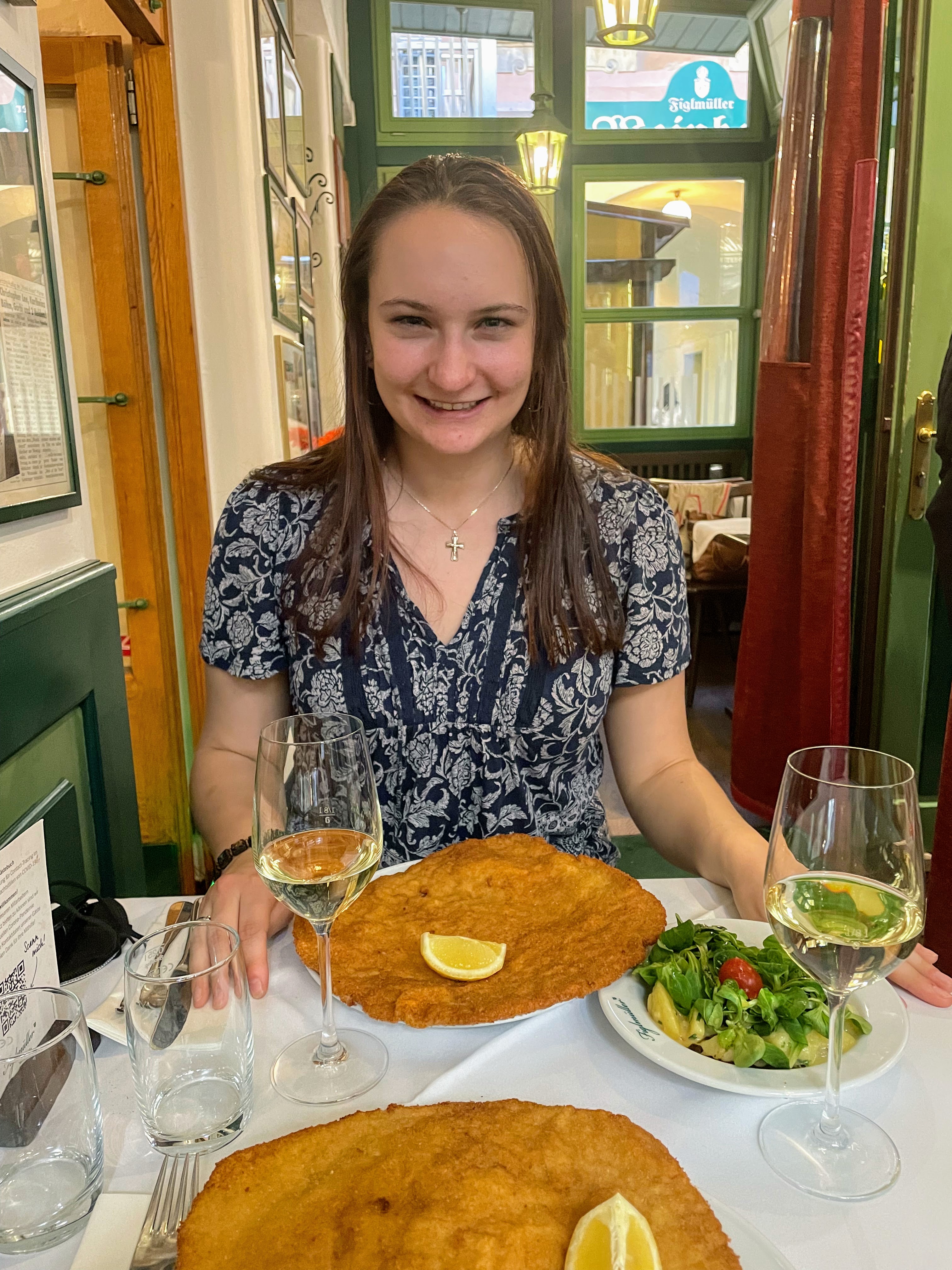 Figlmüller Don’t worry, we had “real” food in Vienna as well. We were fortunate enough to get seats at Figlmuller’s, the restaurant where wiener schnitzel was invented in 1905. Many celebrities and politicians have eaten here, and it is frequented by both locals and tourists. I think we finished our glasses of wine well before we finished our meal because the schnitzels were bigger than our plates! The lemon wedge on top seemed arbitrary, but after a quick Google search, I learned that the lemon juice helps cut the grease from the schnitzel. The more you know!