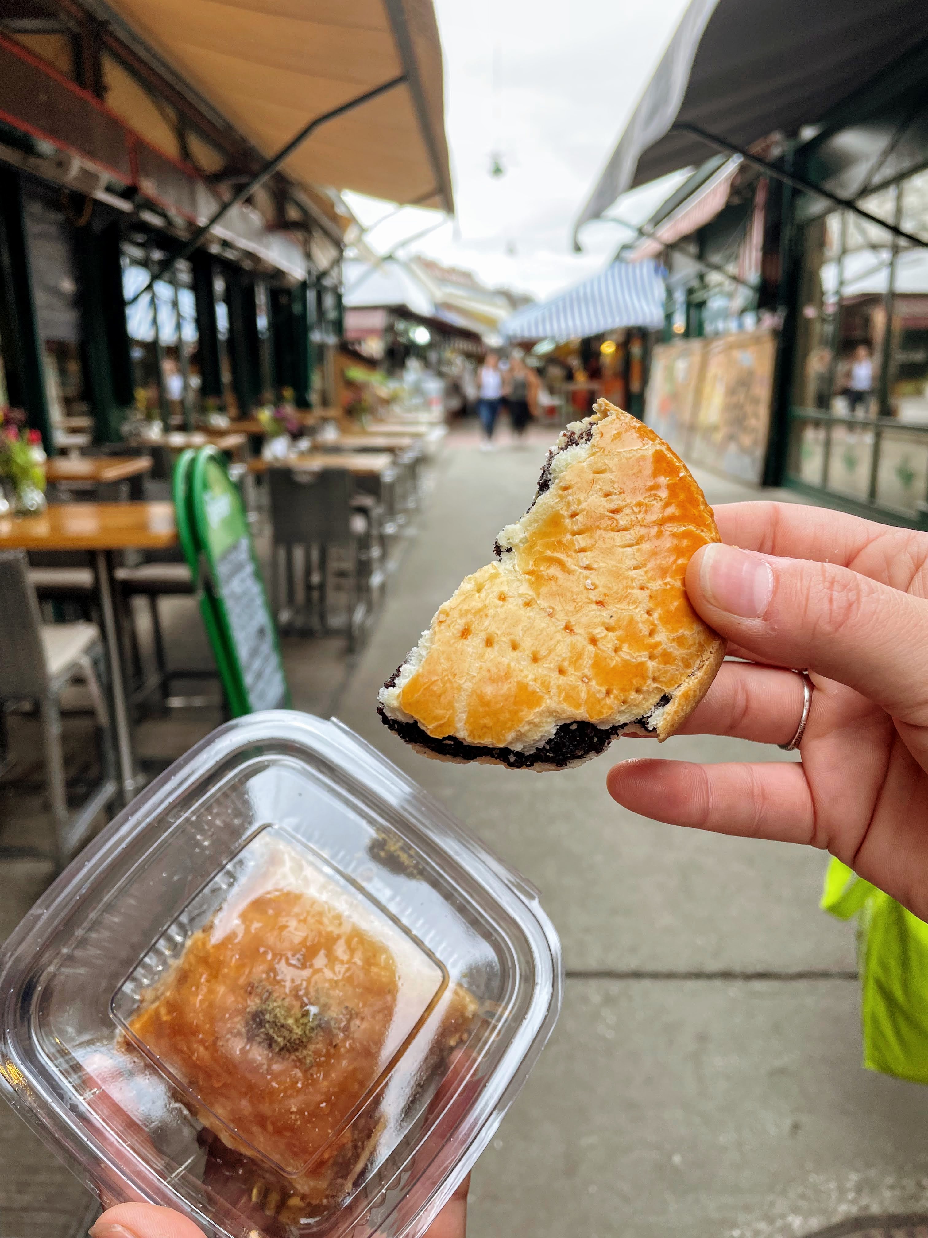 Each time we passed through Naschmarkt, we tried something new. One time, I had shawarma and Rachel had a kebab. Another time, we shared small Picante peppers stuffed with cheese. To start our pastry tour, we split a slice of baklava and a mohnzelten (a potato pastry filled with a poppy seed paste) from the market. All were delicious, of course.