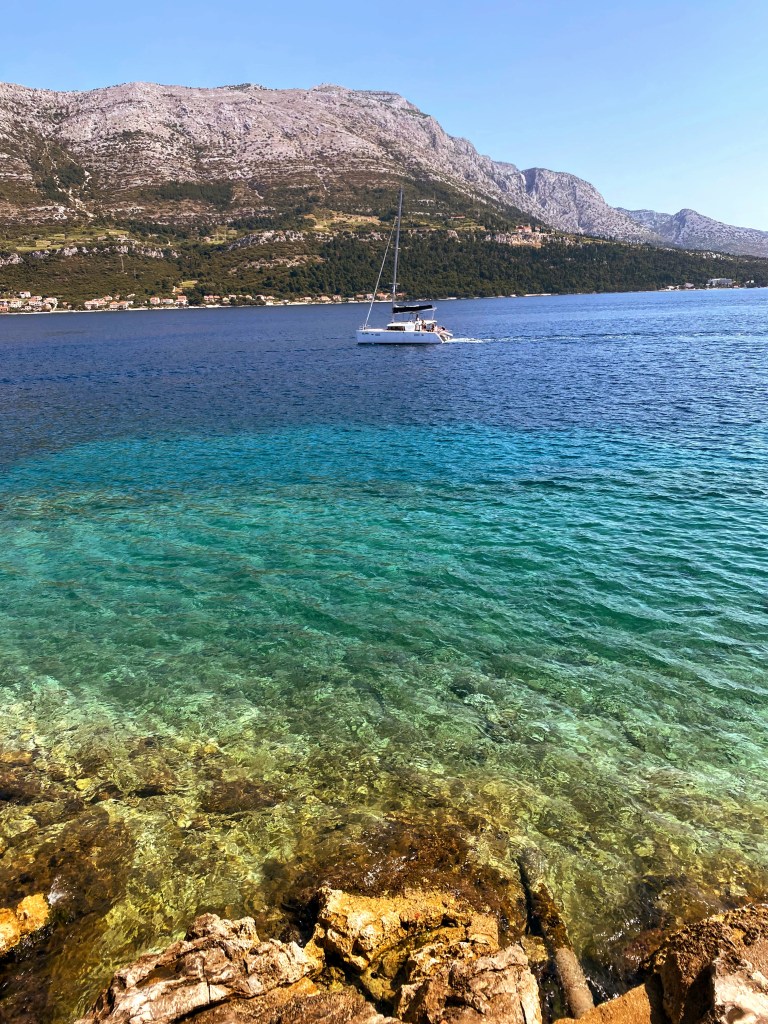The first island I visited was Korčula, most known for producing Grk wine (looks tasty, but I didn’t try it) and claiming to be the birthplace and home of Marco Polo. In the 15th century, Dalmatia (current-day southern Croatia) was ruled by the Republic of Venice. Although historians do not agree if this was his actual home, it is very likely that Marco Polo frequented the island on his voyages. Regardless, I will remember Korčula as the place where an evil seagull stole the last bite of my ćevapčići sandwich from my hands (a Balkan fast food sandwich that looks like a fluffy pita, filled with ajvar, onion, and small sausage links. Anja, my roommate from Serbia, introduced me to ajvar and I am hooked on this red pepper, tomato, and eggplant spread). Korčula’s old town is designed like a fish bone, and it did not take long to meander through its entirety. The pebble beach and clear water were nothing like I’ve seen before, and the cold sea was refreshing after the hot sun.