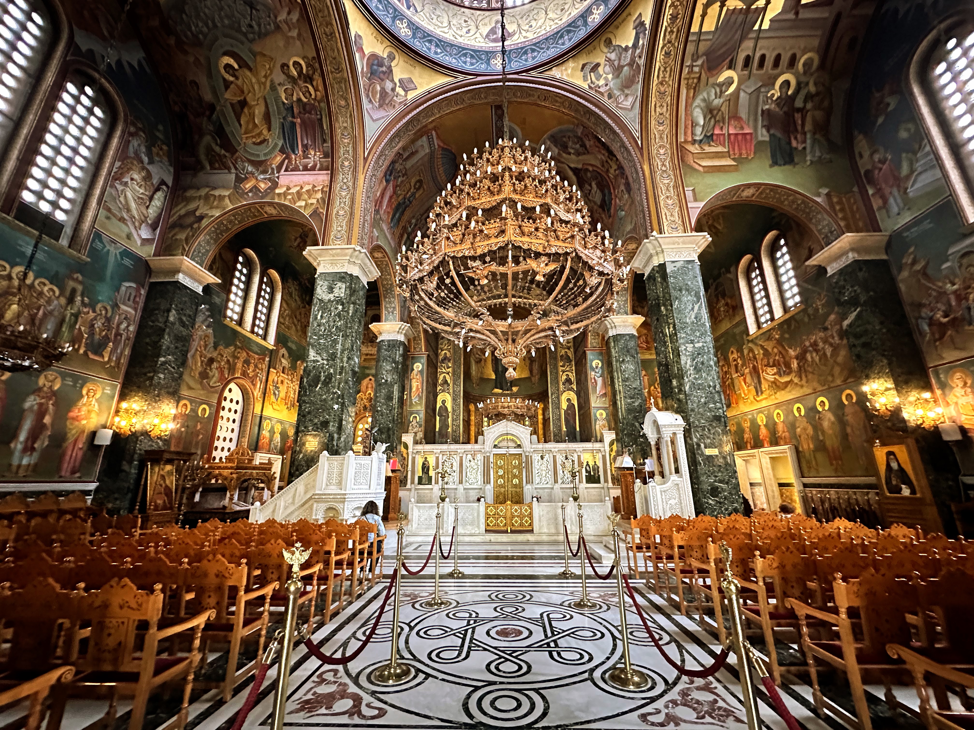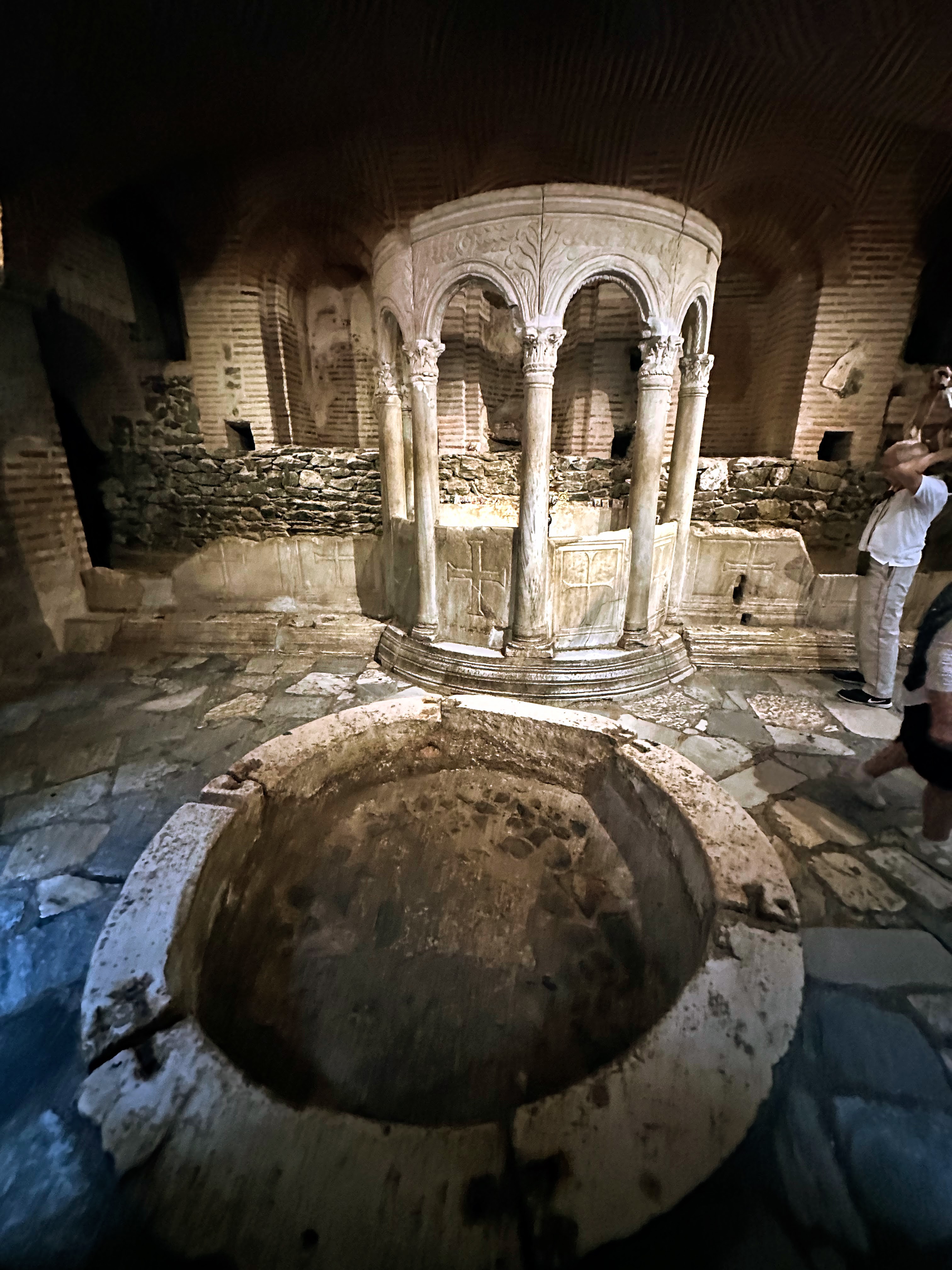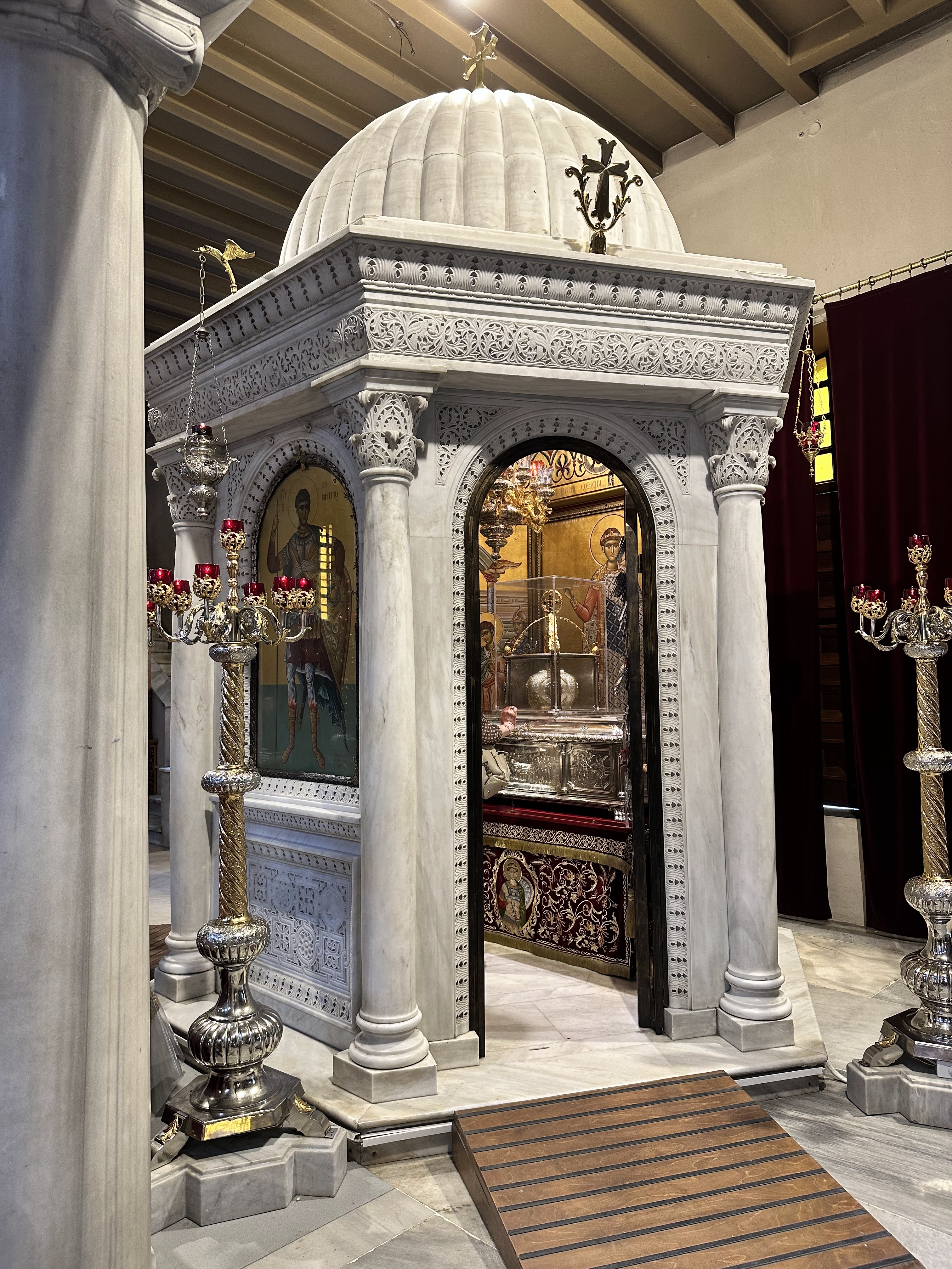 I first walked to the Holy Church of St. Demetrius and intruded on a baby’s baptism. It was fascinating to see a baptism in the Orthodox church- it is so different than what I’ve seen! The Orthodox liturgy had incense, chanting, and marching around the baptismal font, which is not common in the Roman Catholic rite. I watched the liturgy for about 30 minutes, and it seemed the sacrament would continue much longer than I had time for. St. Demetrius is an important site for Greek Orthodoxy. Here, early Christians built a church around the well where the Romans disposed of St. Demetrius’ body after his martyrdom. From his crypt, sacred myrrh can still be collected. Visitors to the church could pray at his crypt and bless themselves with the myrrh oil. I bought my brother, Dmitri, an icon and blessed it with the holy myrrh.