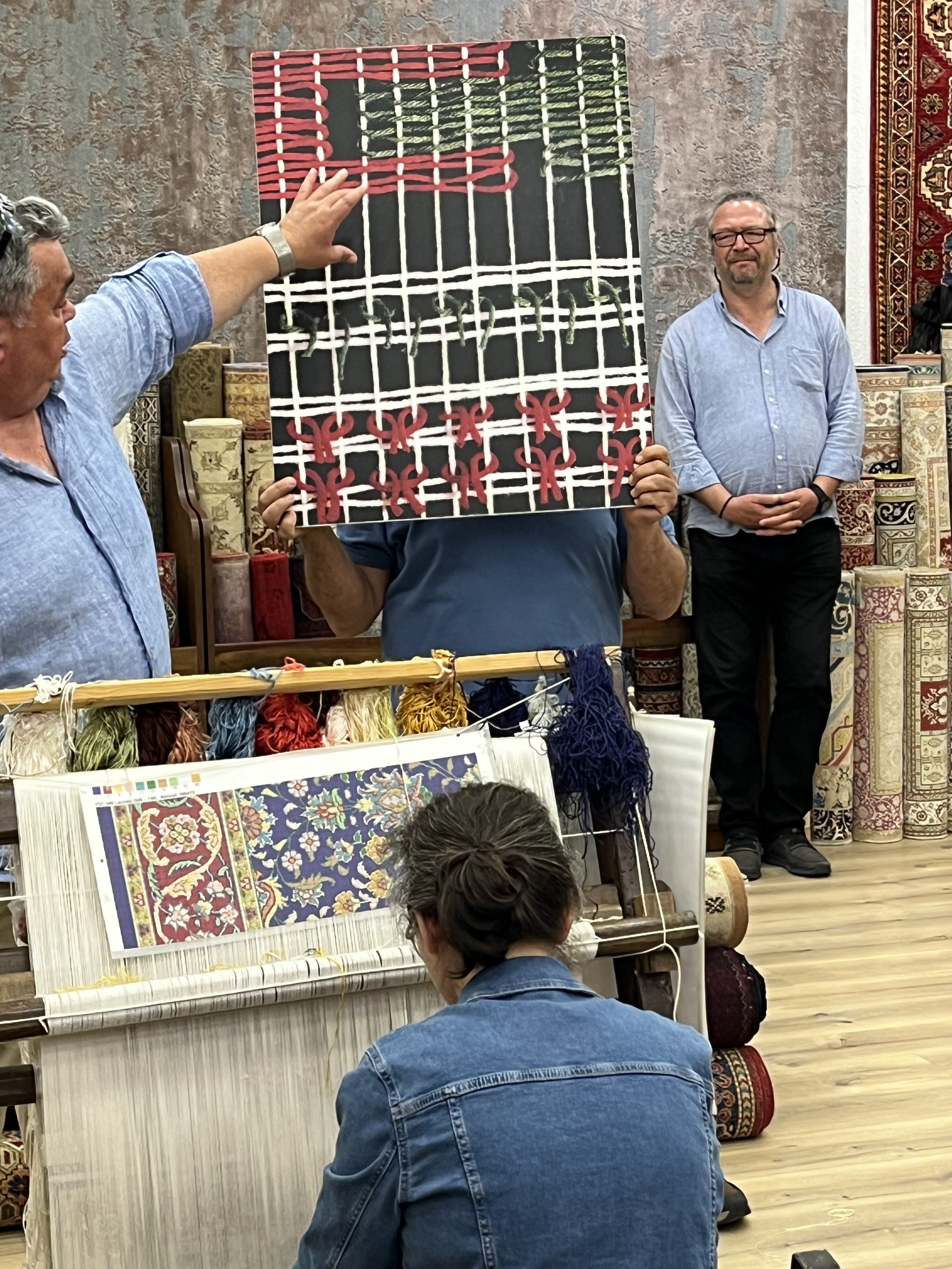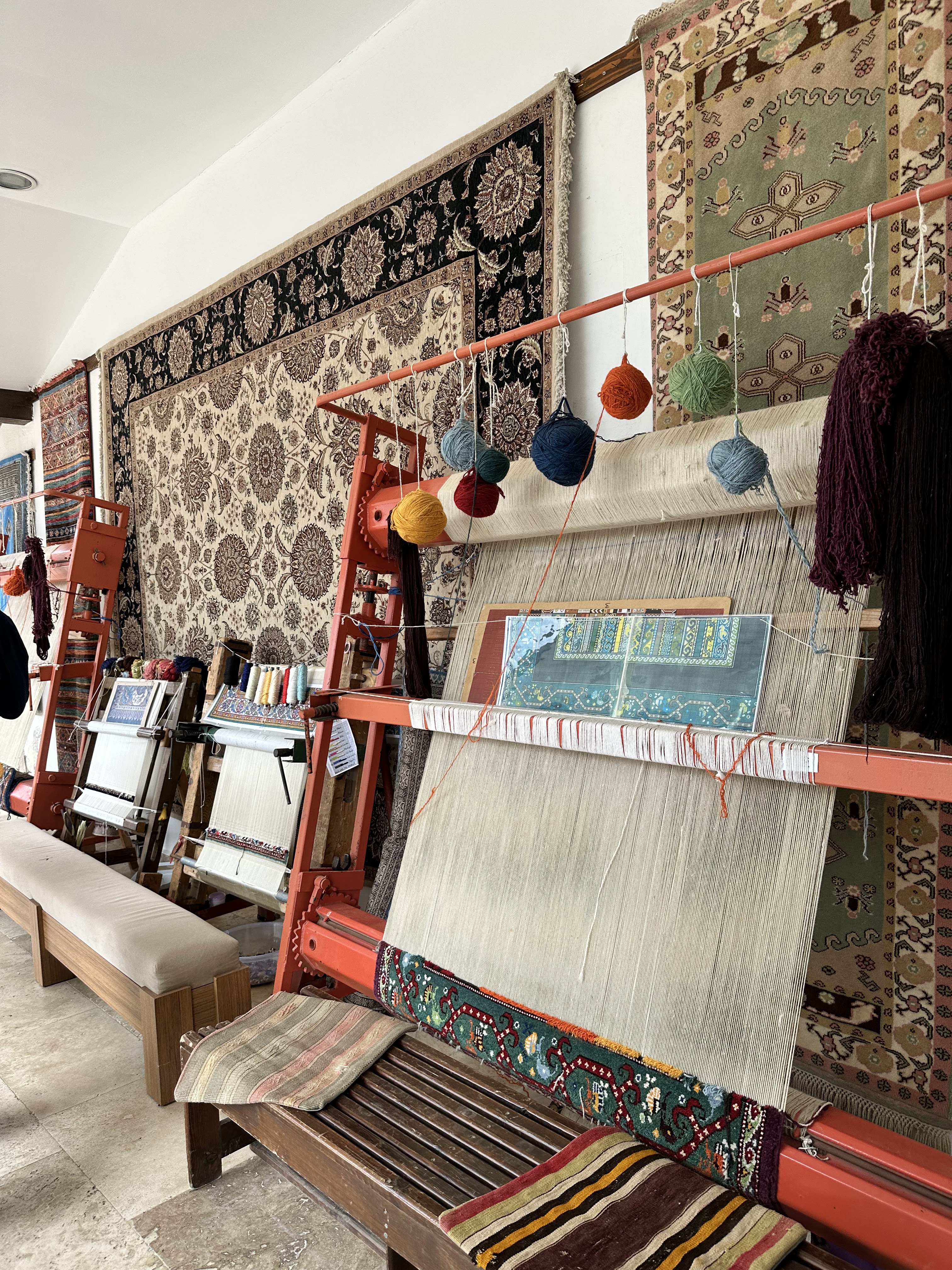 At the rug-making business, the owner guided us through the entire process of making a double-knotted Turkish carpet. First, we saw how threads are pulled from silkworms and woven into threads. Then, the thread is dyed different colors and left to dry until it’s ready to be knotted into a rug. We saw a woman sitting at a loom and tying knot after knot- her fingers worked so quickly! The weavers only work a few hours a day because the process takes a toll on their fingers and vision.