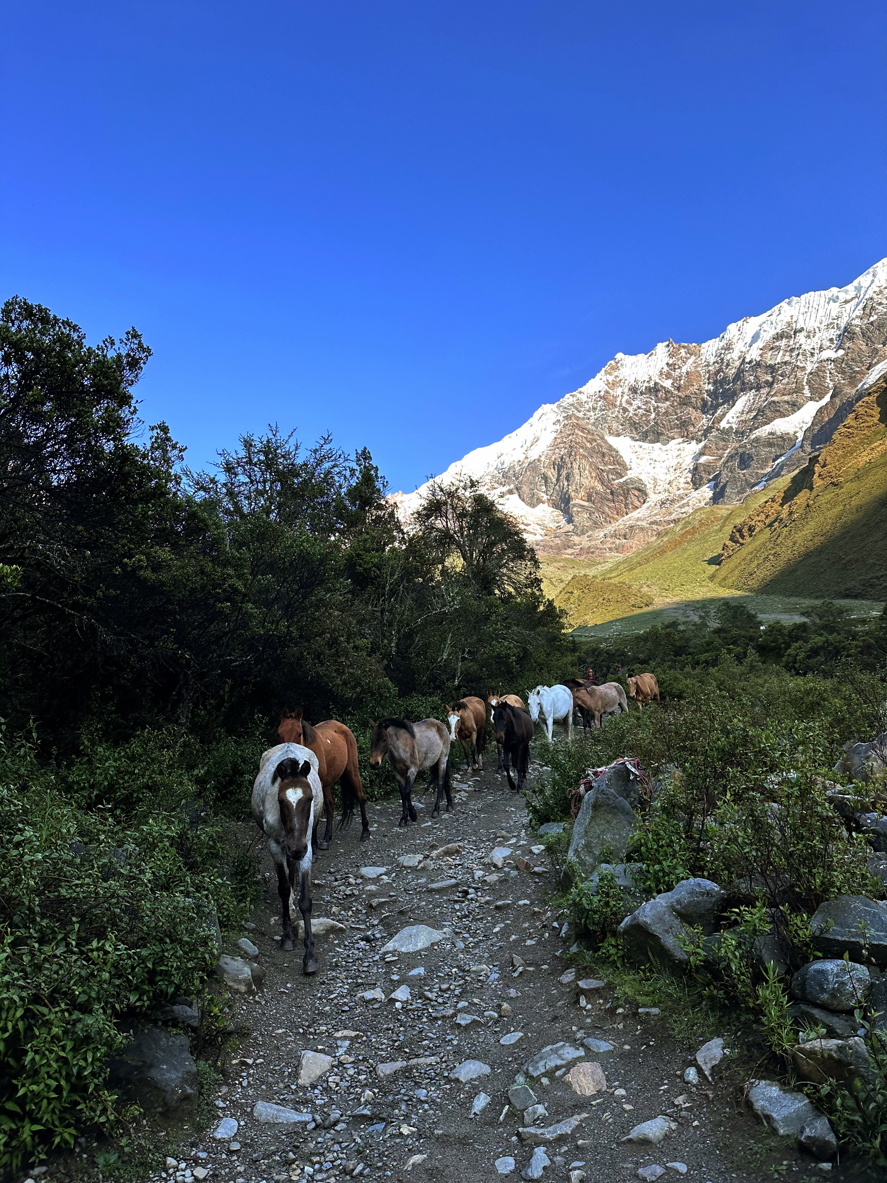 From the Salkantay pass, we walked downhill to our campsite. Walking downhill was much harder for me, and I relied on hiking poles to take the pressure off my knees. On our descent, we saw llamas, horses, and chinchillas! The scenery and weather changed quickly as we left the mountains.