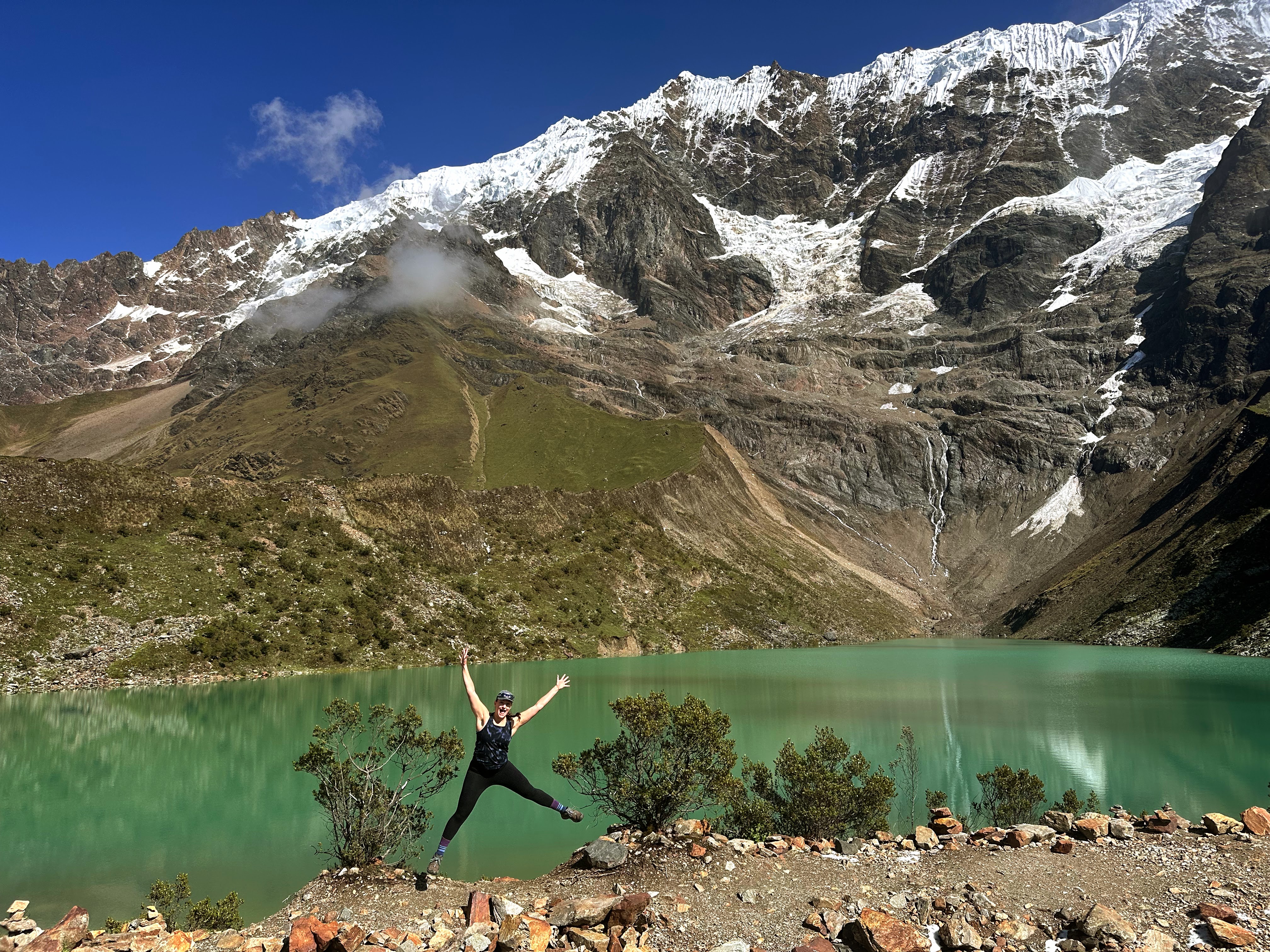 After lunch, we hiked another 30 minutes of incline to the Salkantay pass. I was the first to make it to the top, and I had fun cheering on my group as they made the final ascent! I felt so accomplished, proud, and grateful at the top – I researched and trained well for this hike and the feeling at the top was electric. Everyone’s mood became lighter and more joyful at the top. We completed the hardest part of the week on Day 1!