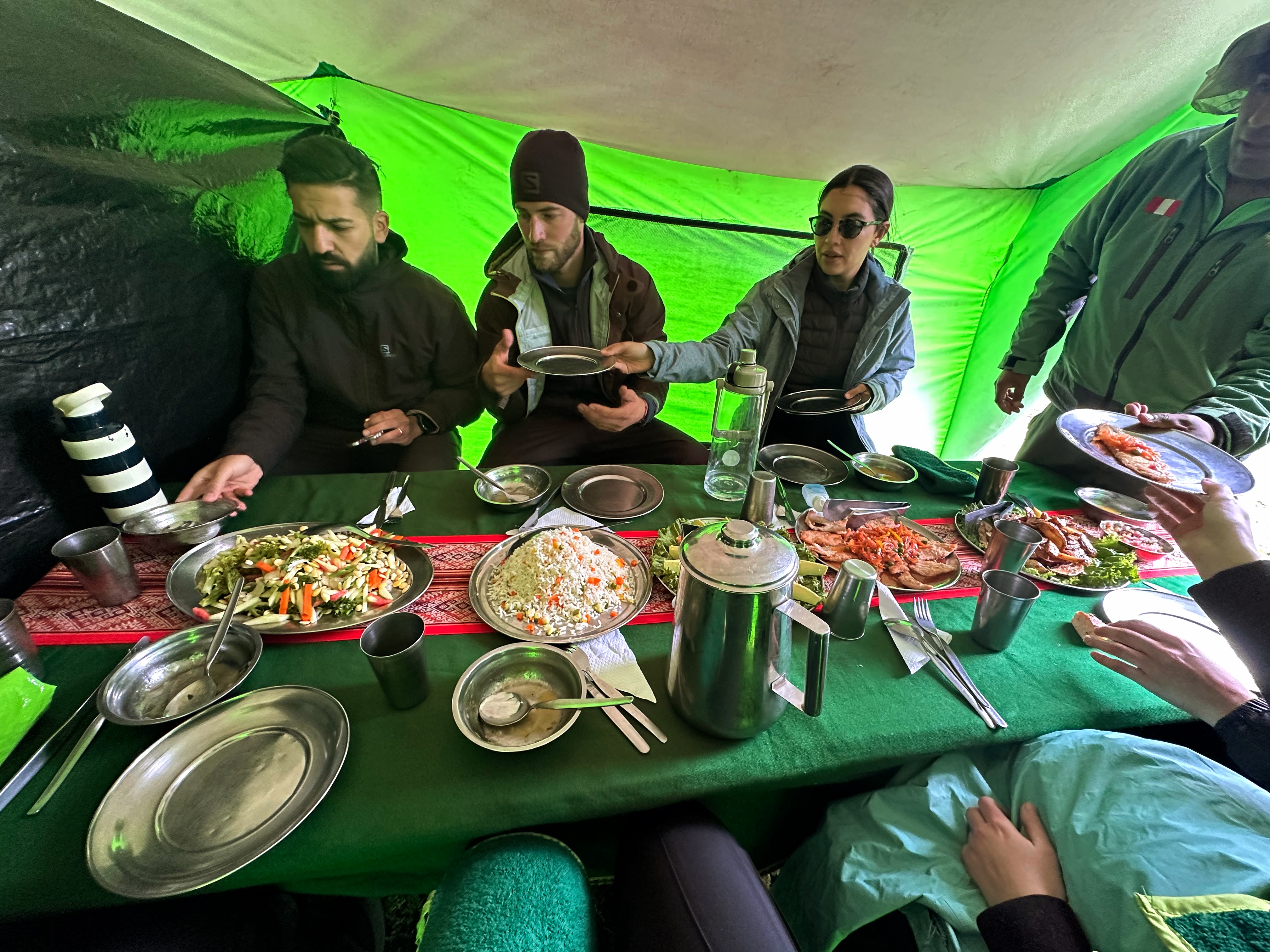 After another two hours of gradual incline and one hour of steep incline, we came to our lunch spot. I was too out of breath to chat with my group members, so I spent most of my mental energy praying a rosary during the climb. The porters and chef hiked ahead of us to have everything prepared for our arrival. At each major stopping point, they pitched the dining and sleeping tents, set up a chemical toilet, and boiled water for our bottles.