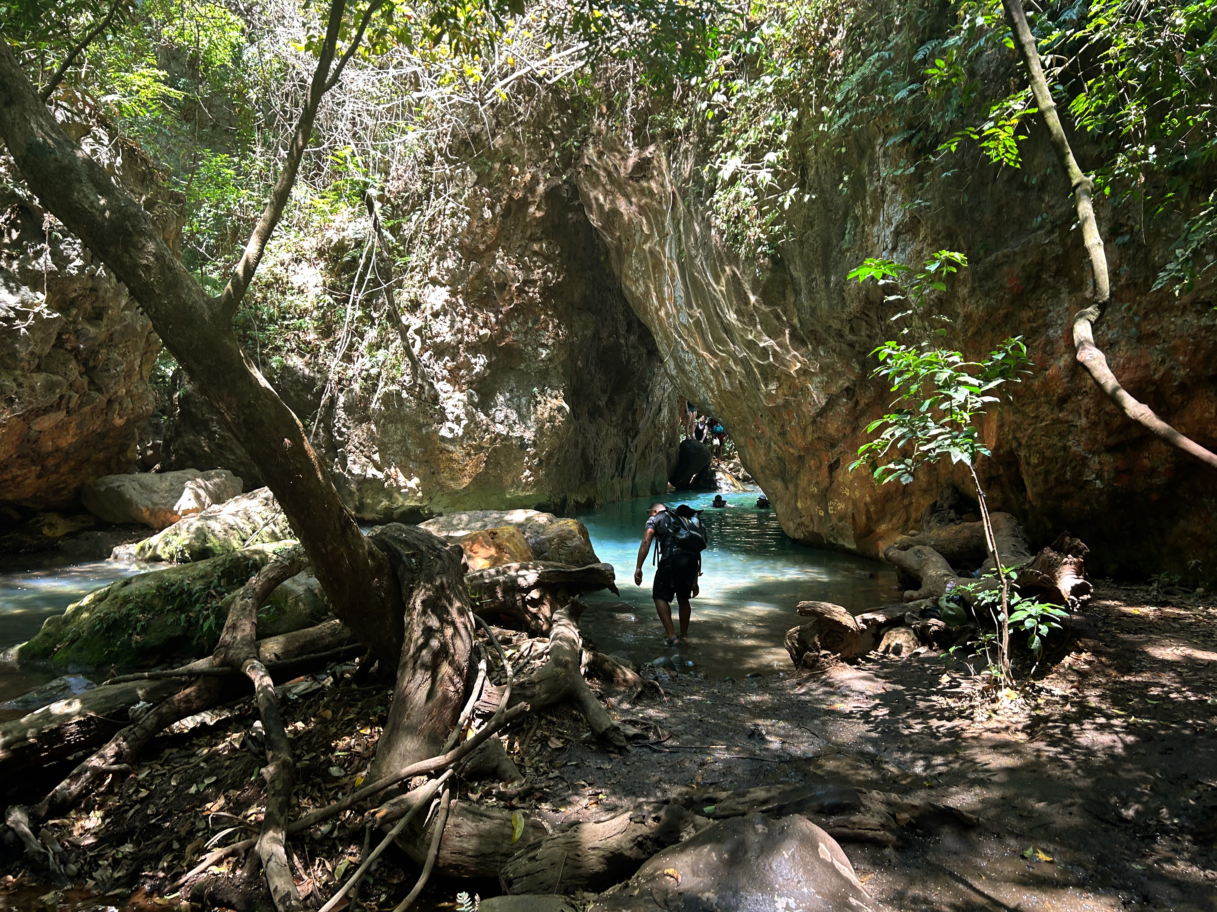 The hike was a moderately difficult and only 1 ½ half miles to the waterfall. We walked alongside the creek until we reached the canyon entrance. To reach the waterfall, we had to swim against the current in the small canyon with a rope and Daniel helped us climb over a few slippery boulders. The water was clear and turquoise because of the natural minerals, and it was so refreshing to swim at the base. How cool!