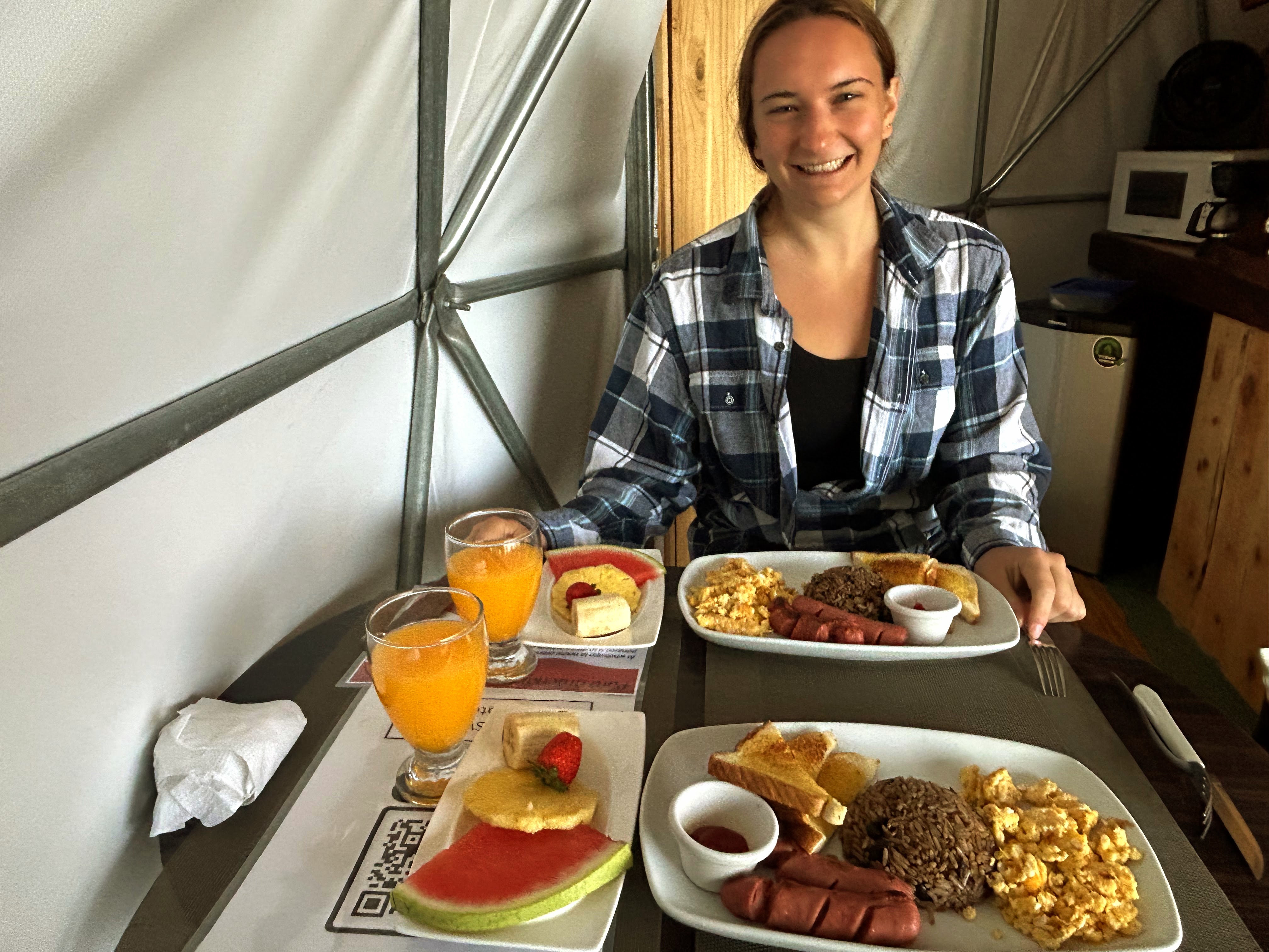 My favorite time of day is the early morning, just after sunrise when most people are sleeping, and the only sound is of chirping birds. The weather was perfect to wake up early and journal outside of the camping dome. We ate breakfast in our dome, and then drove to the Poás Volcano National Park. When we arrived, we watched a safety video and were assigned red helmets. It was an easy walk to see the crater, and we were instructed to only look at the crater for 20 minutes because of the toxic gases. The last time this volcano erupted was in 2019; how wild is it to be so close to such a powerful force of nature?!
