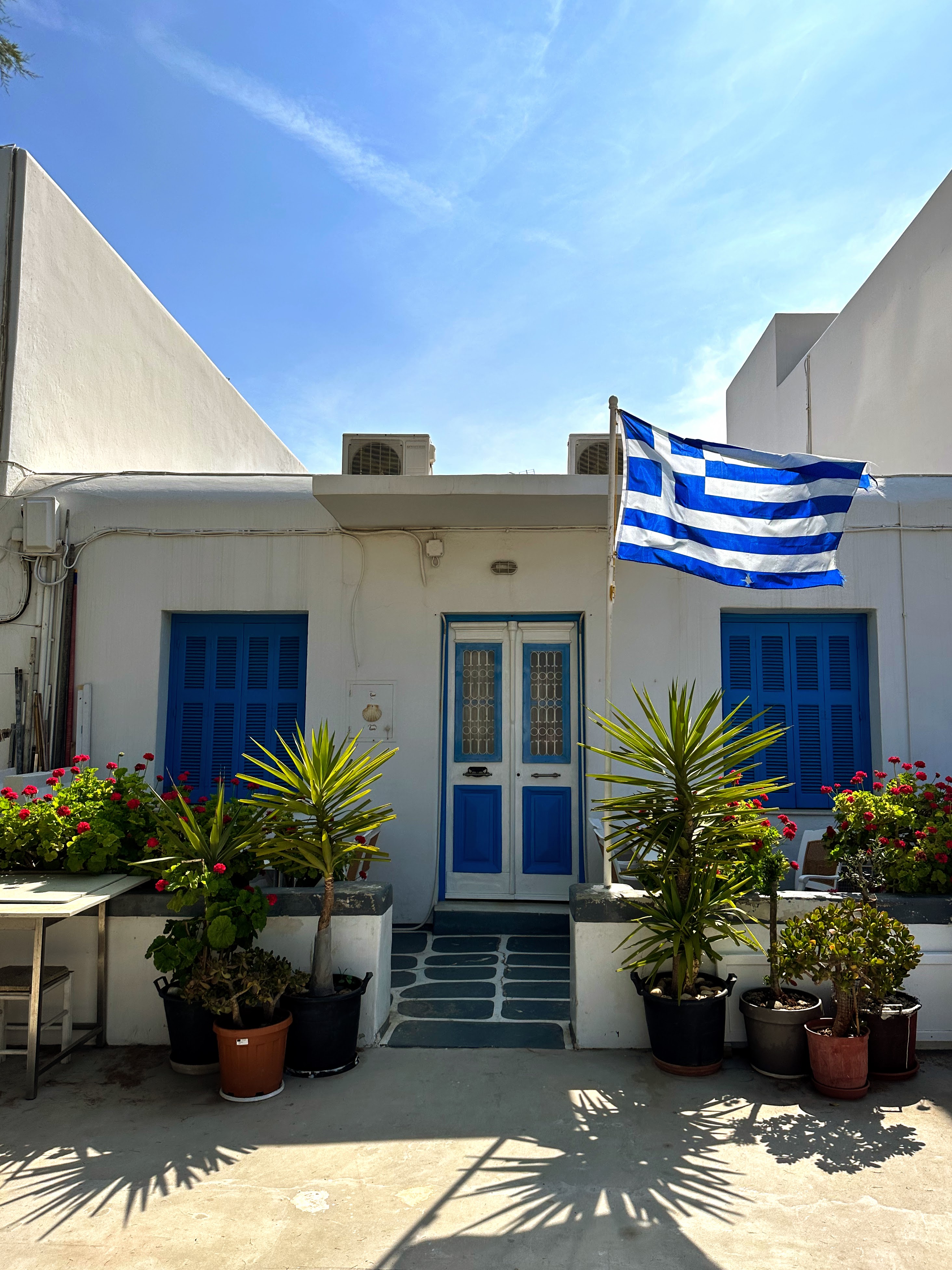 On Mykonos, Mom and I had our own adventures in the morning. Mom toured the uninhabited island of Delos, the birthplace of the mythical Greek gods, Artemis and Apollo. I spent the day wandering the tight, winding streets of the city center. Mykonos is exactly how I pictured a Greek island to look like: whitewashed buildings accented with royal blue, perfume of flora and fauna blossoming from windowsills, narrow pedestrian streets with slinking cats weaving through crowds of excited tourists. I strayed from the busy main street and found a quiet, garden café, where I spent an hour drinking a Greek frappe (instant coffee whipped with sugar and cream), journaling, and reading my book. Afterwards I toured Lena’s House – a preserved 19th century Mykonian home.