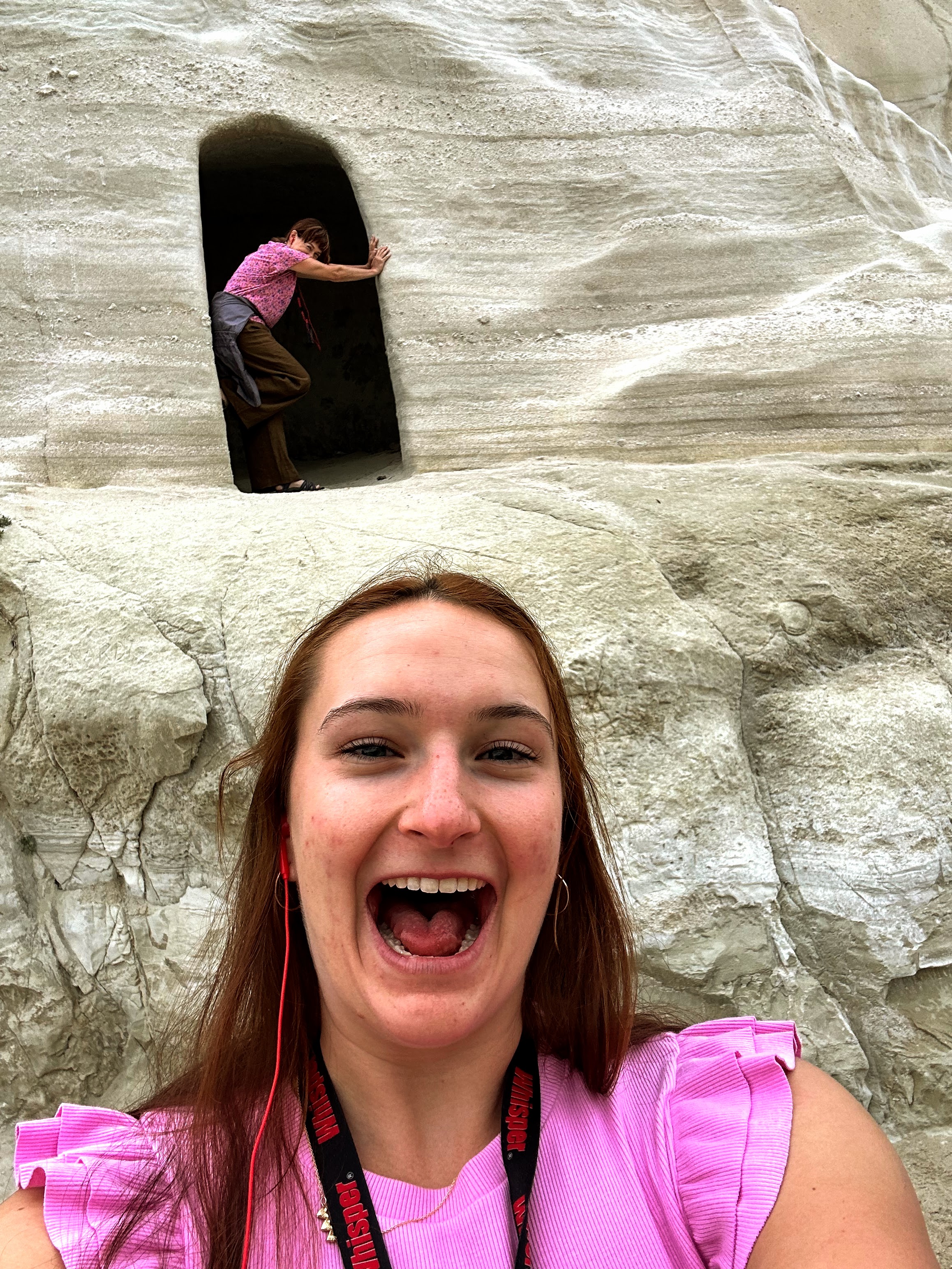 We were both amazed by Sarakiniko Beach. The white volcanic cliffs made it seem we were walking on the moon. Our tour guide explained that the contrast between the white rock to the typical blue sky is better seen on a clear day. Unfortunately, we visited Milos on one of the few days that rain falls on the island, and the white rock looked grey in the overcast weather. Still, we saw the unique beauty of this natural formation and enjoyed climbing around the formation.